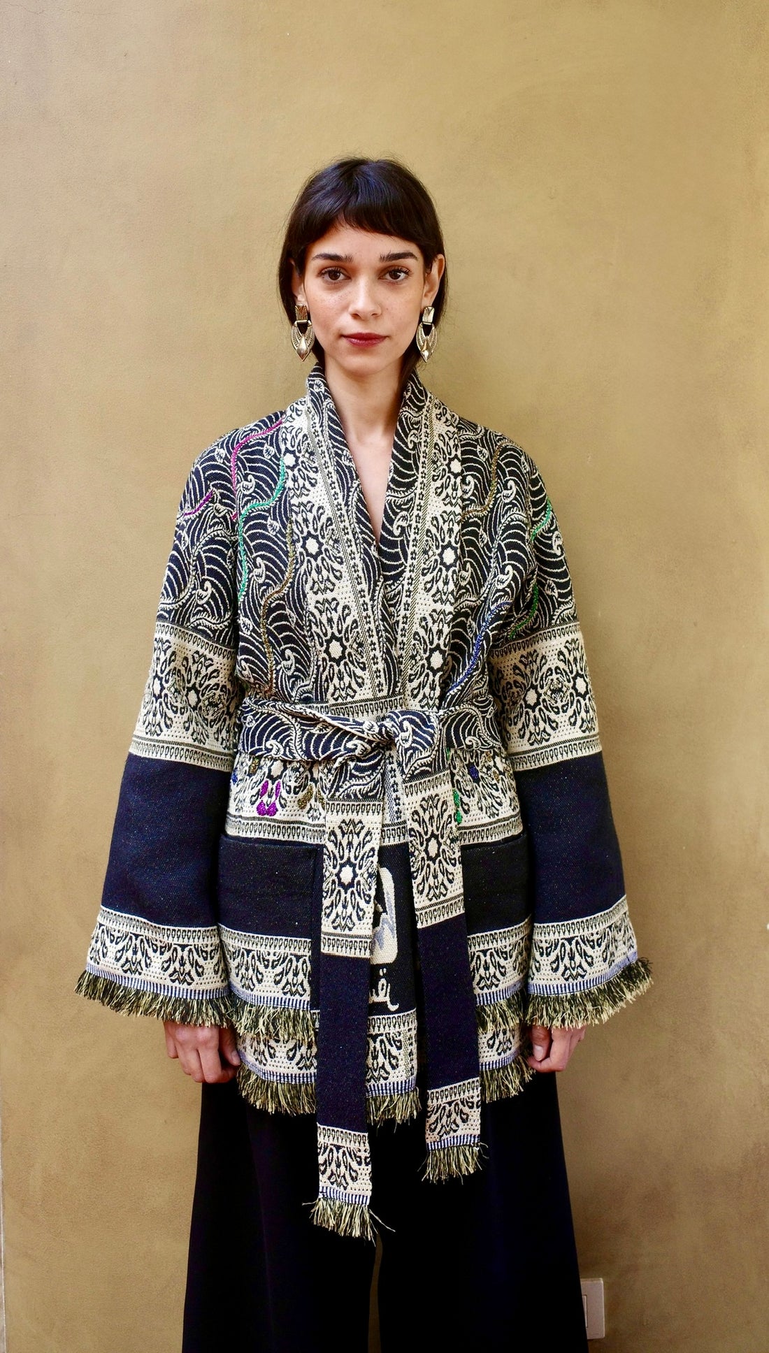 Woven cotton wool mix mid-length, reversible omda kaftan with fringes at the sleeve and at...