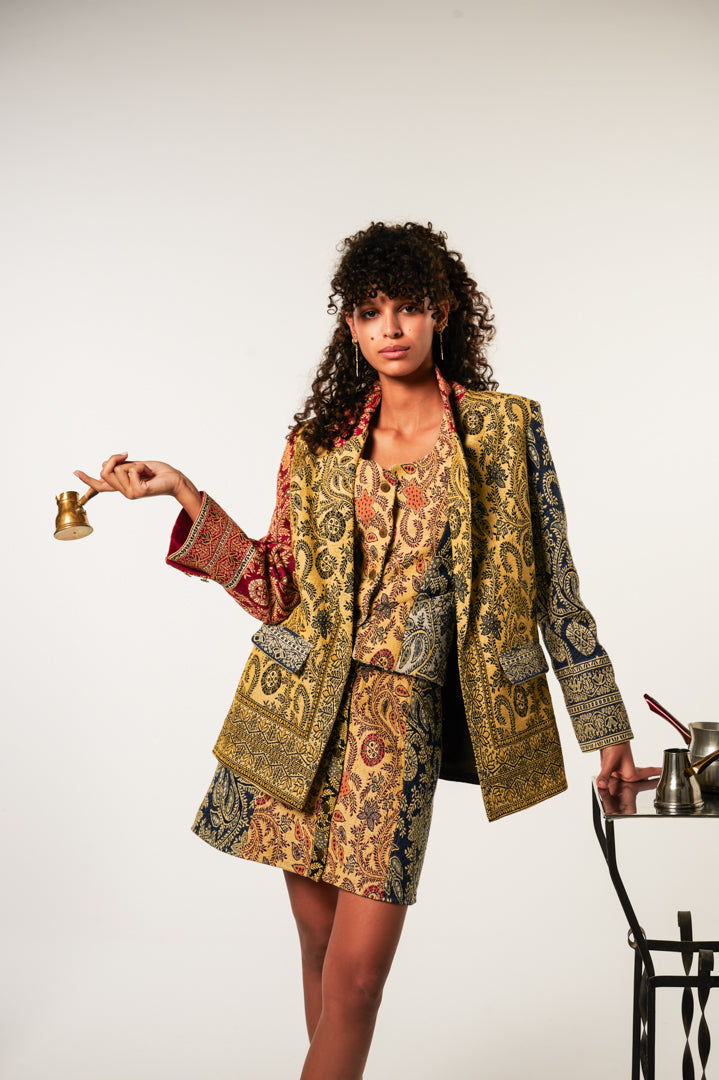 Oversized unisex half-sleeve shirt, features color-blocked printed material.