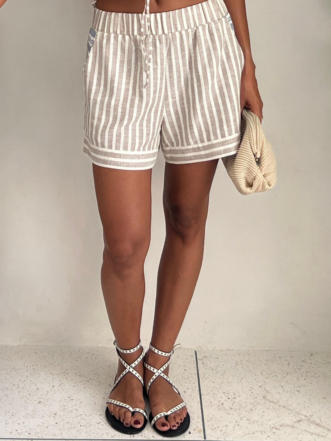 Striped linen halter top with striped collar and button stand. Backless with elasticated band. Color:...
