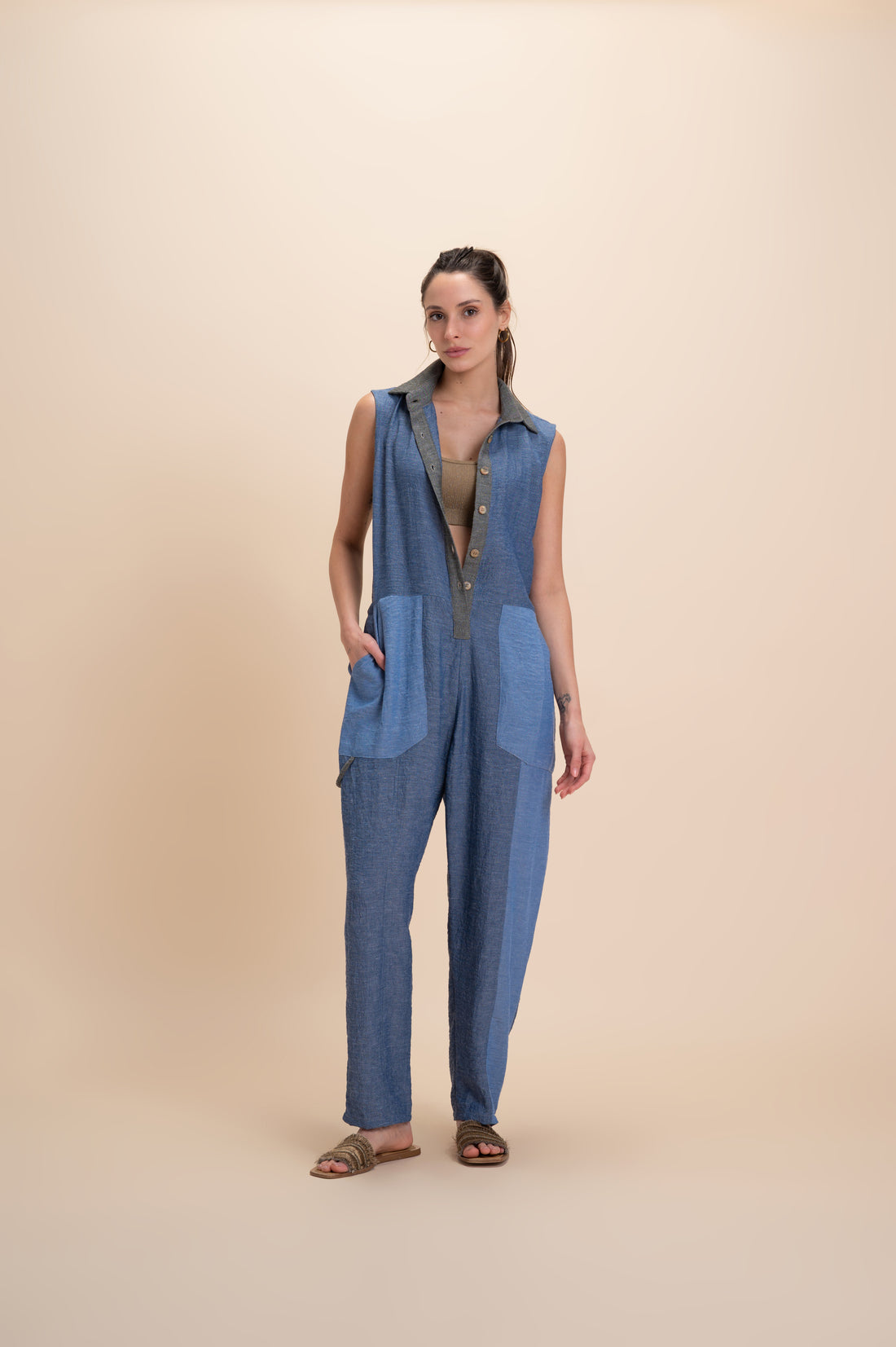 Light linen cotton faded denim. Color blocked. Oversized fit with big front pockets. Removable waist...