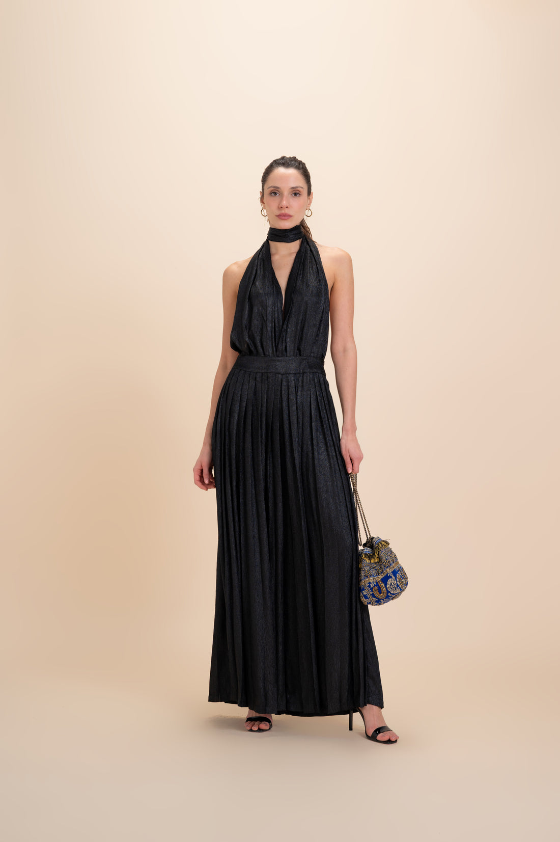 Black pleated silk jumpsuit with removable top section straps. Back zip closure. Straps can be...