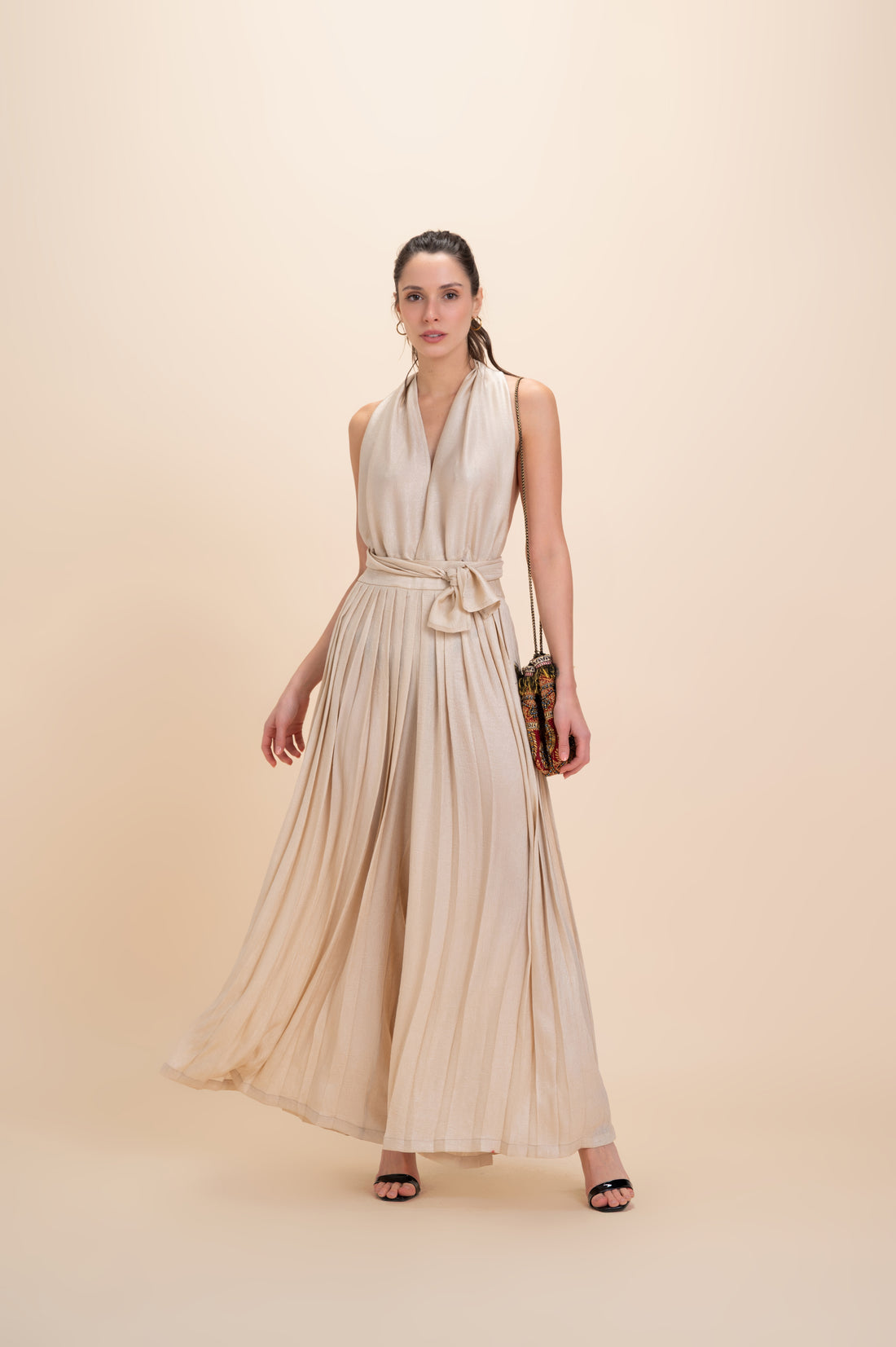 Champagne pleated silk jumpsuit with removable top section straps. Back zip closure. Straps can be...