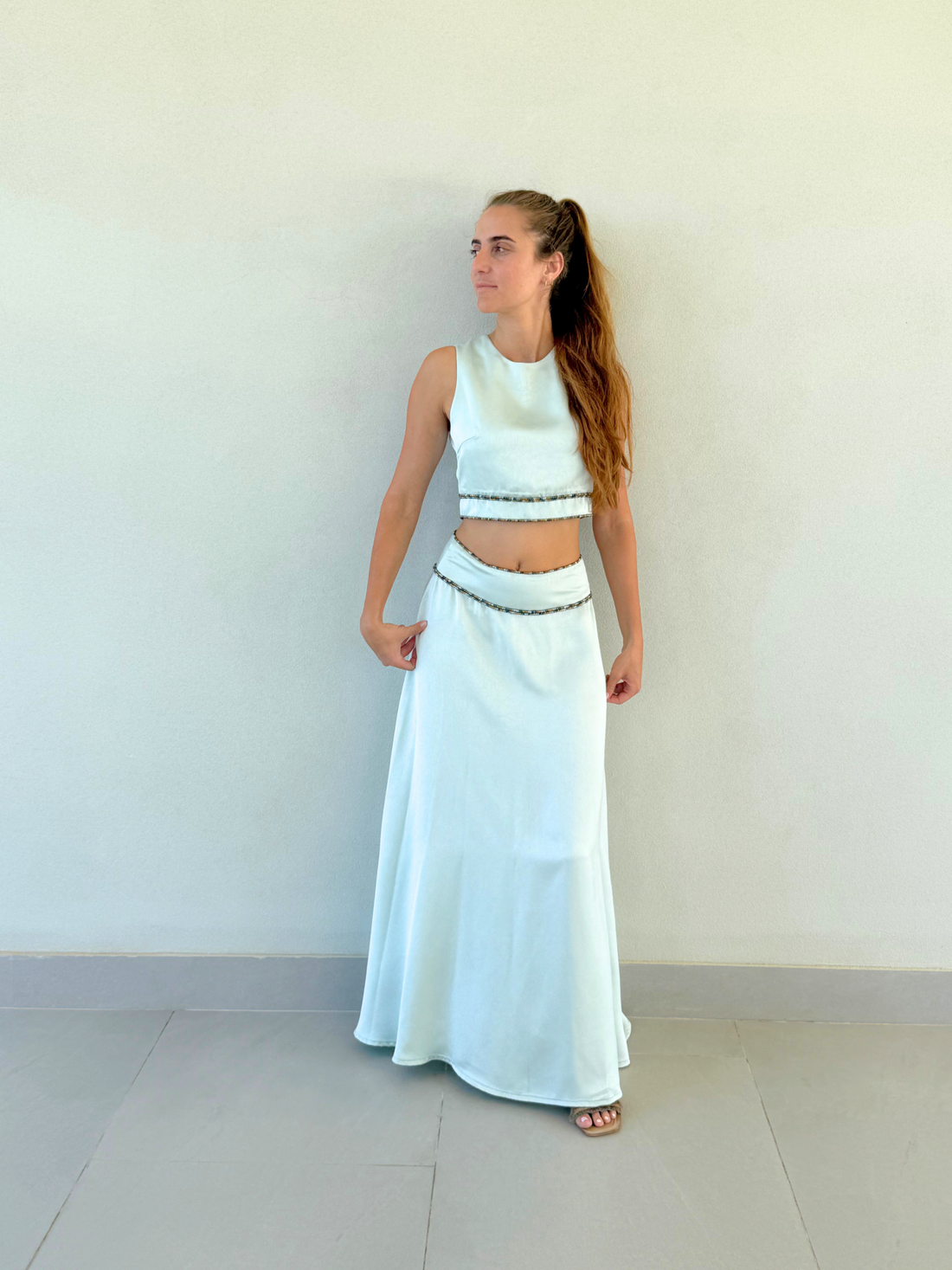 Maxi mint A-line satin skirt. Knee high side slits. Center back zip closure. Hand beaded...