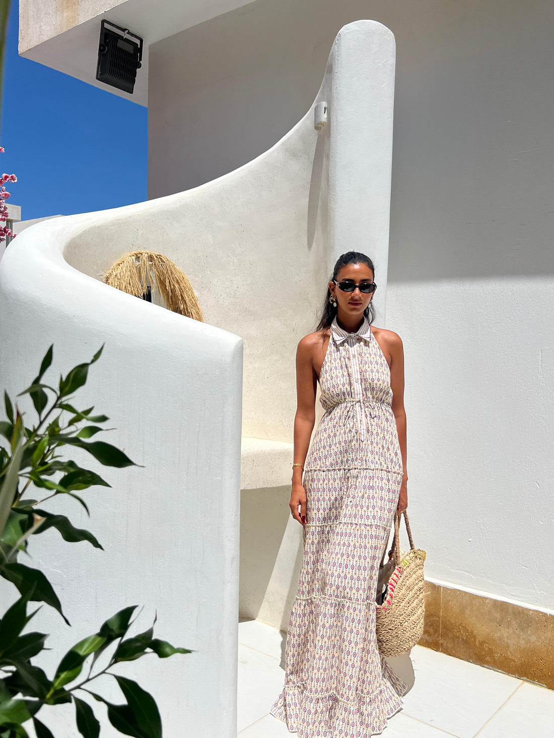 Cotton printed halter maxi dress with striped collar and button stand. Backless with. elasticated band....