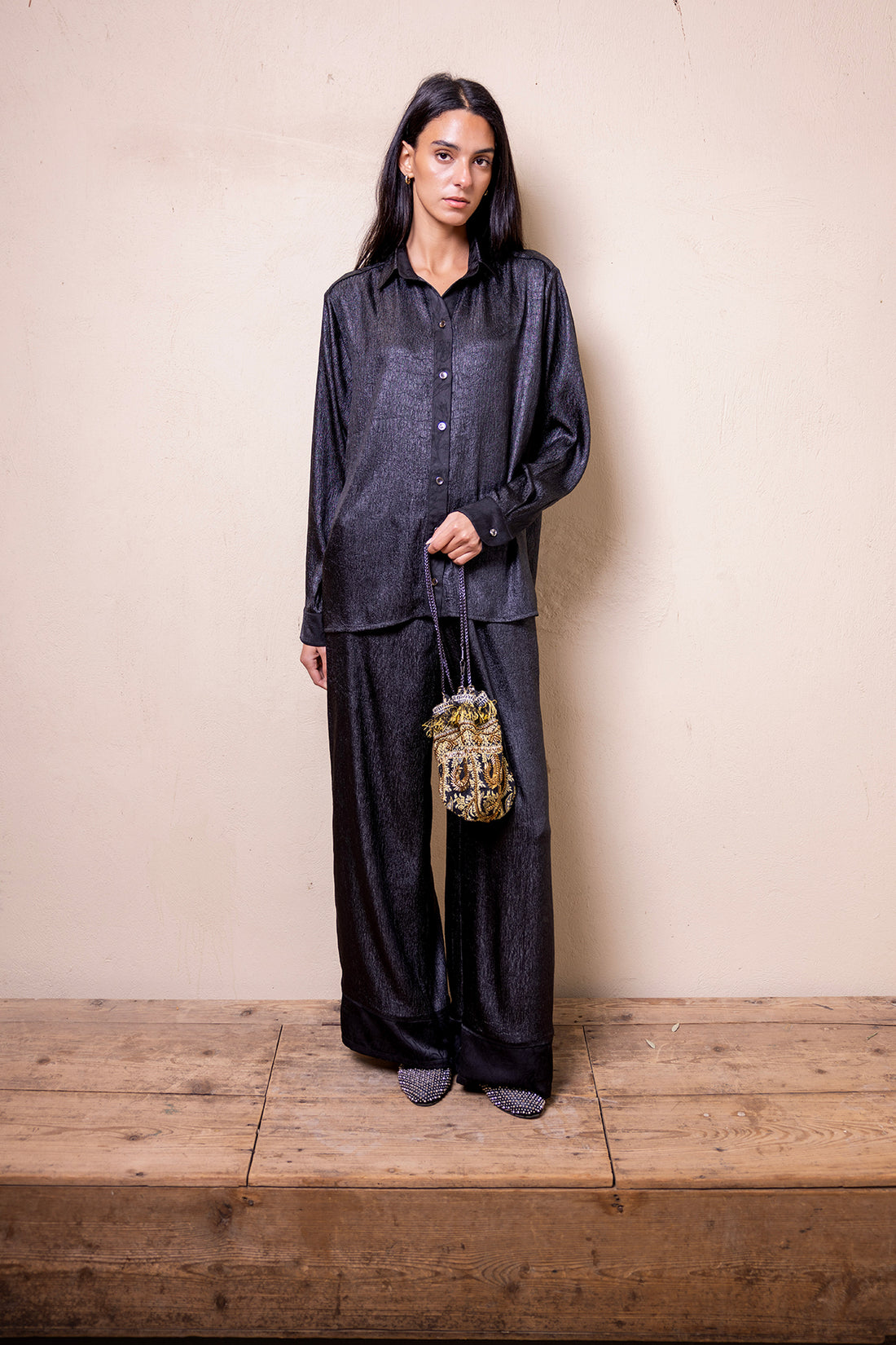Oversized shimmery silk satin shirt with smoky silver buttons.