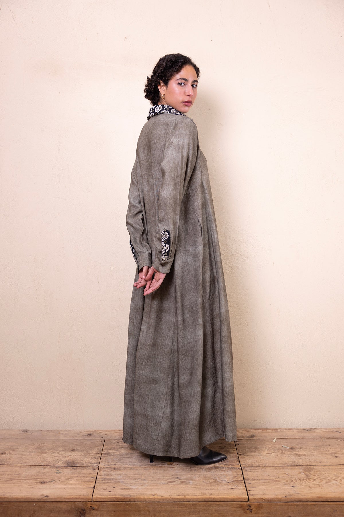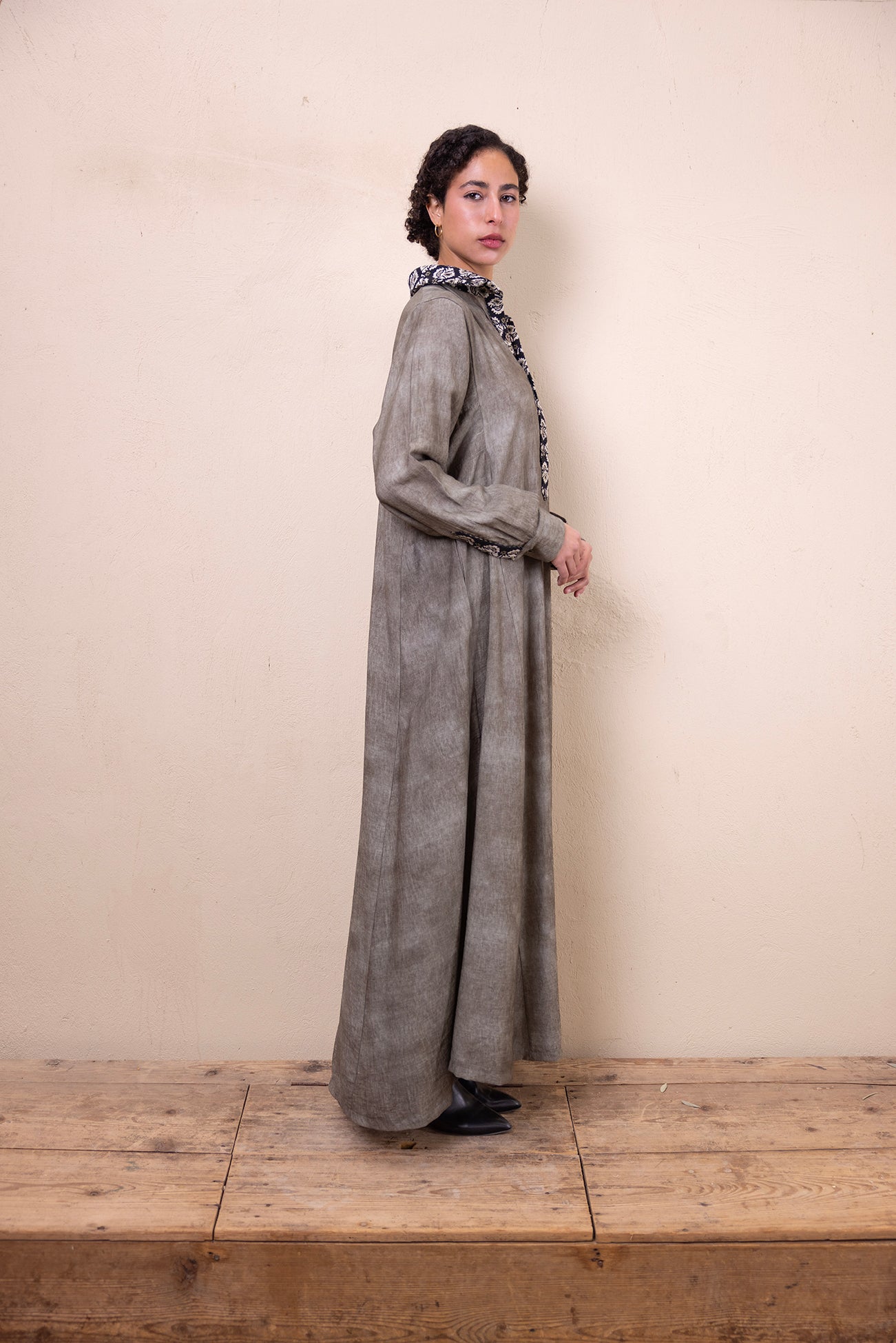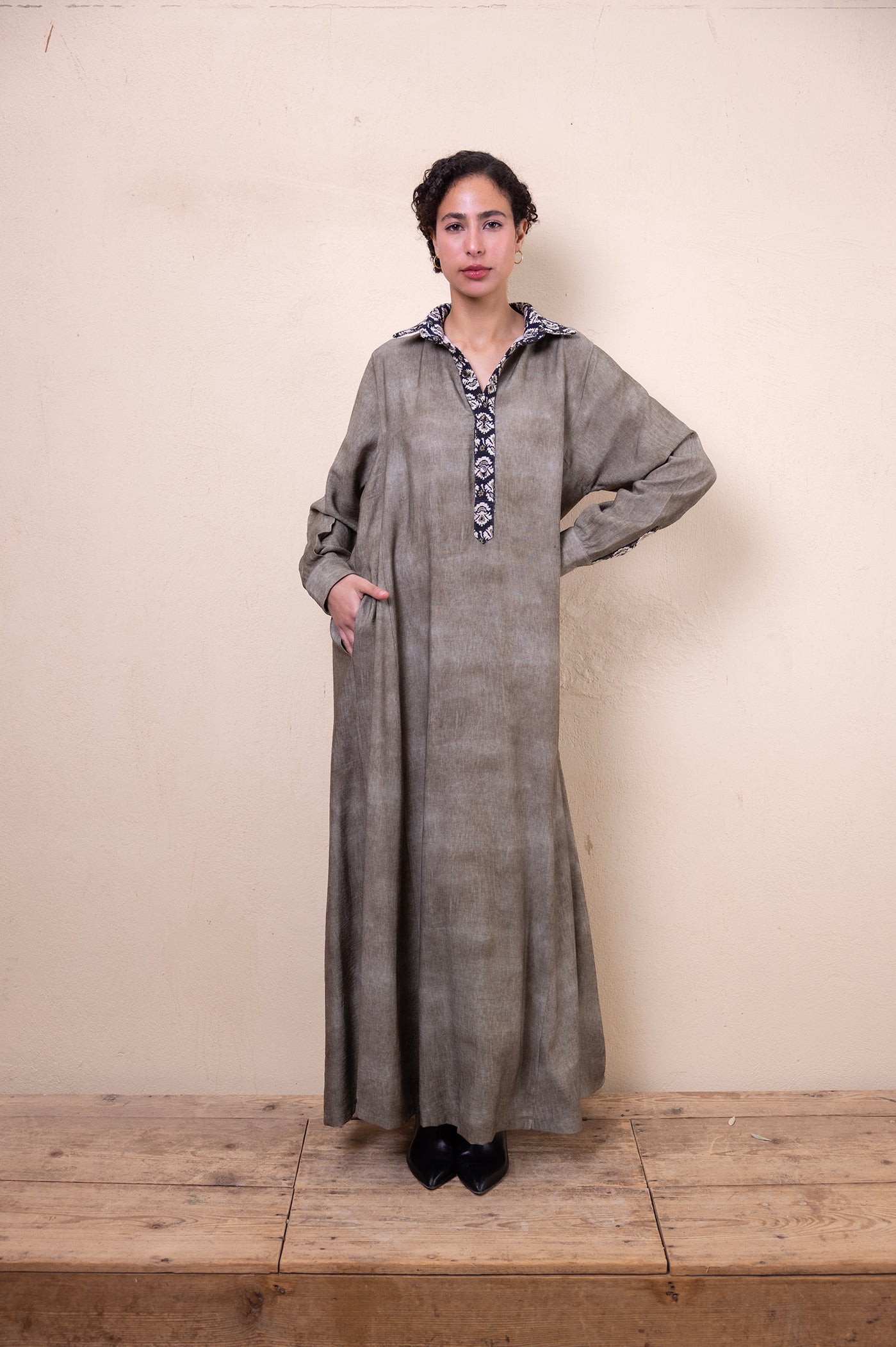 Button-up cotton linen mix Galabeya with a Omda pattern detailed button-stand and big side seam pockets.
