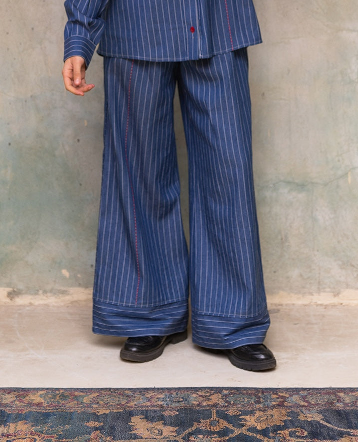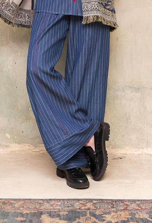 Oversized cotton linen pants with an elasticated waistband, white pinstripes and a subtle red hand-embroidered line detail at the side