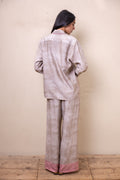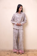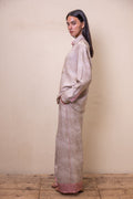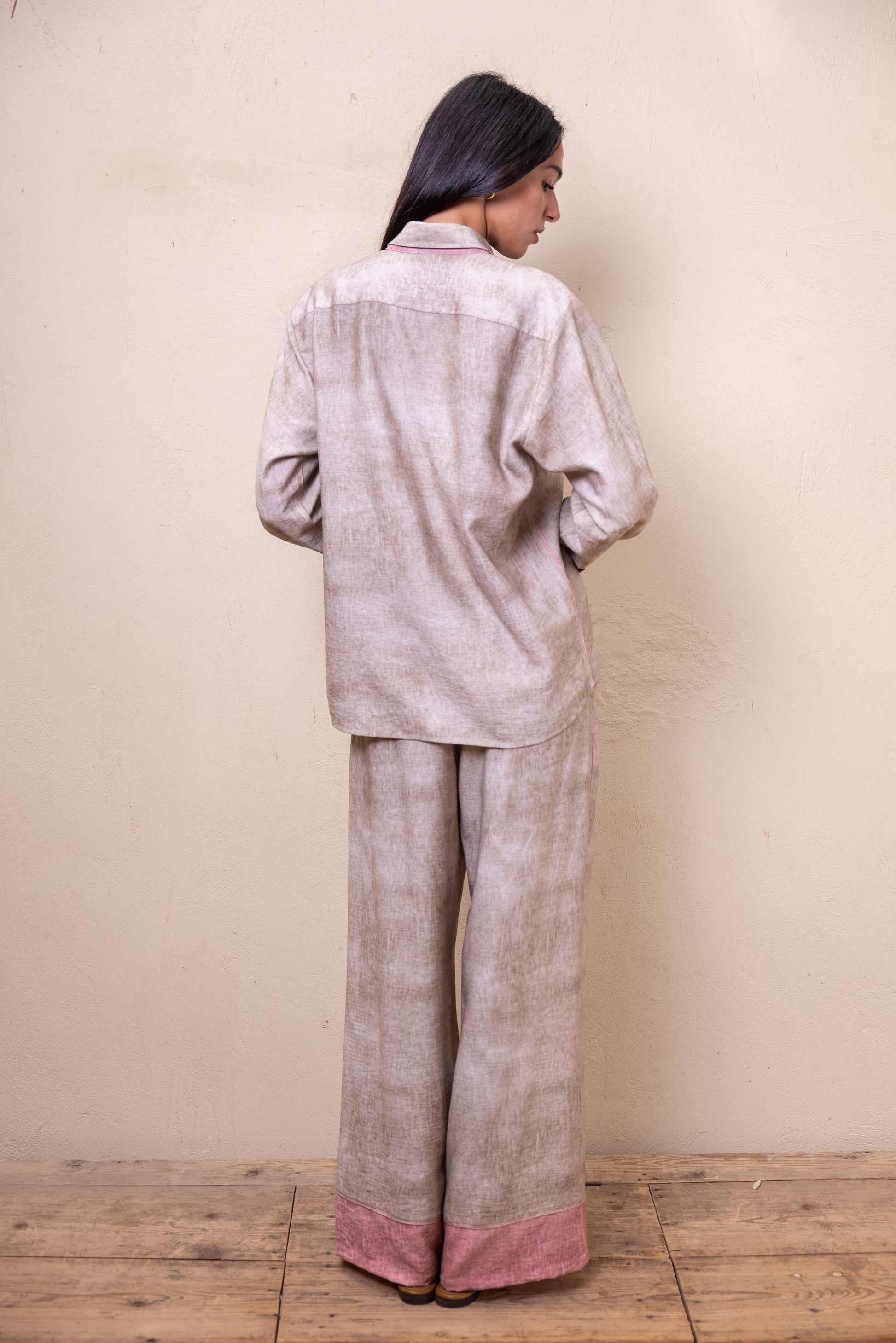 Oversized linen mix shirt with with dusty pink piping detail down the sides and a dusty pink cuff detail.
