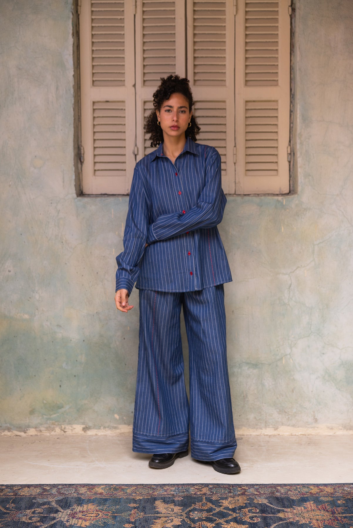 Oversized cotton linen shirt with white pinstripes, red buttons and a subtle red hand-embroidered line detail at the side.