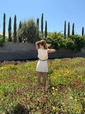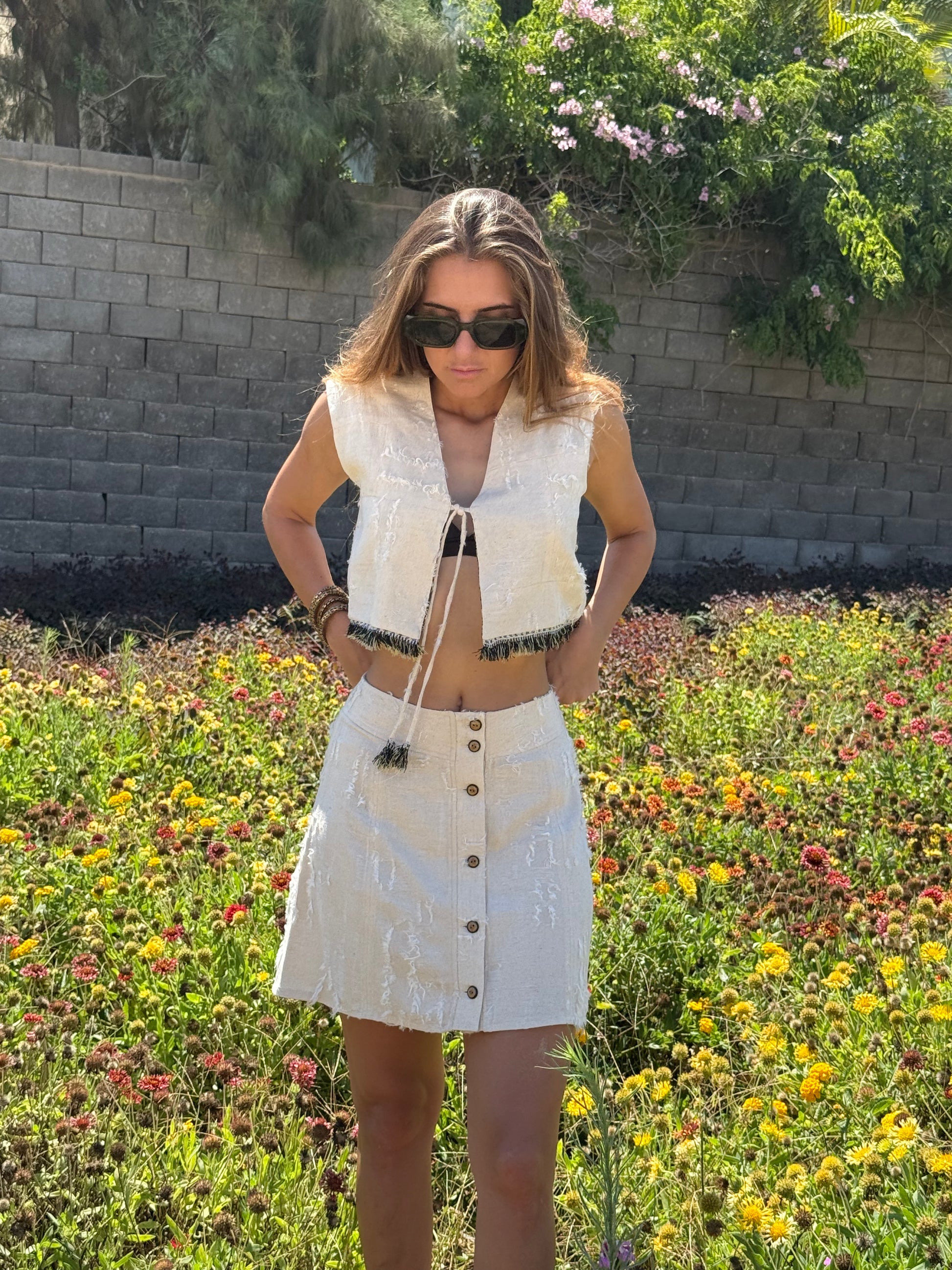 Beige linen vest with lined printed cotton viscose. Featuring OMDA fringes at the hem. Front tie closure.