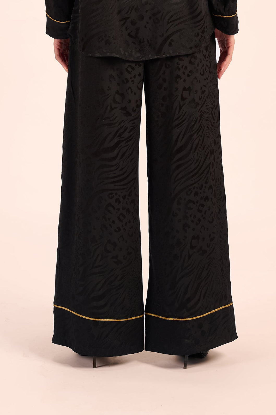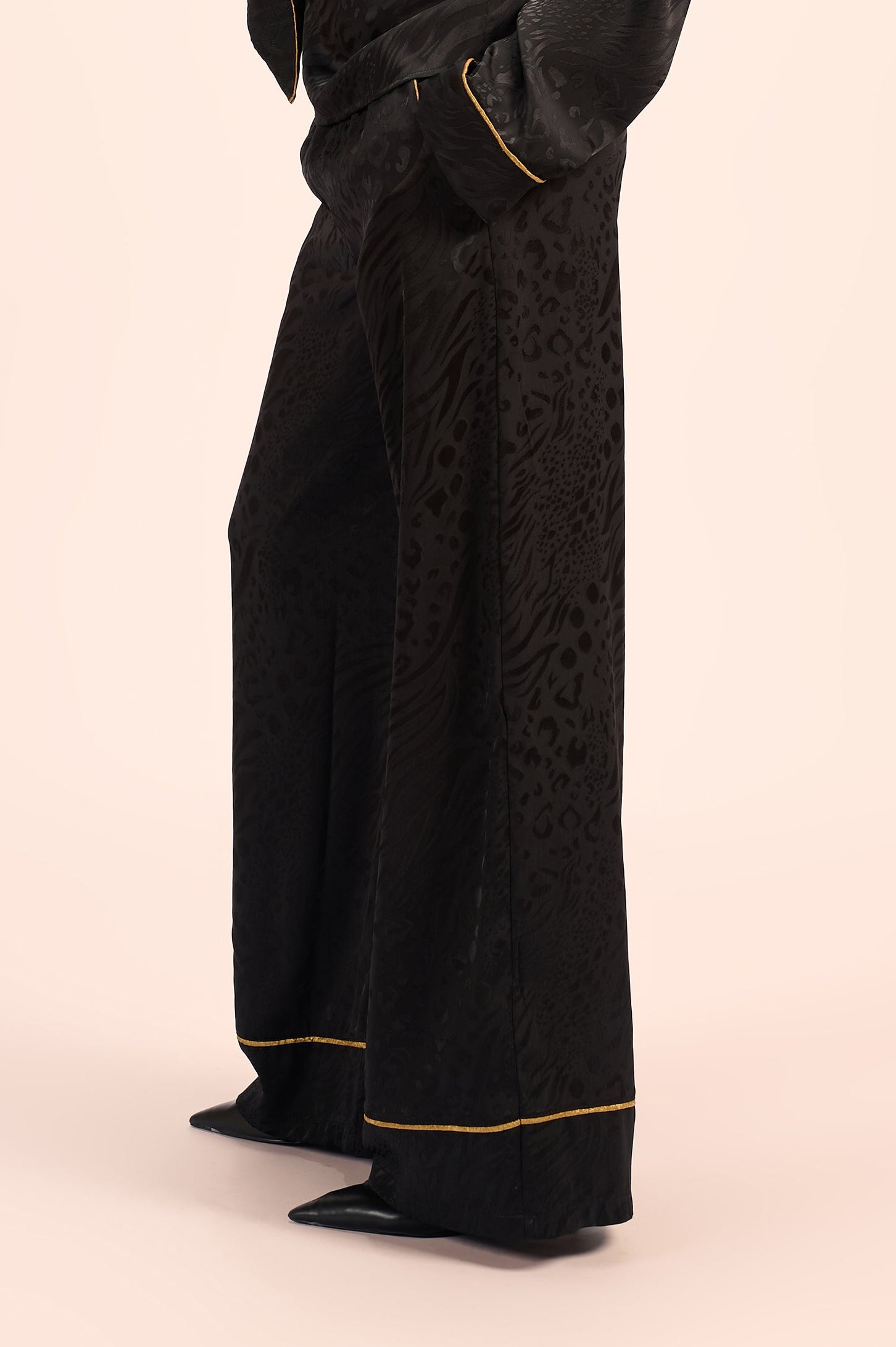 Animal printed silk/satin pants with golden piping along the sides and hem. Featuring sideseam pockets and an elasticated waistband. PJ style.