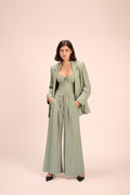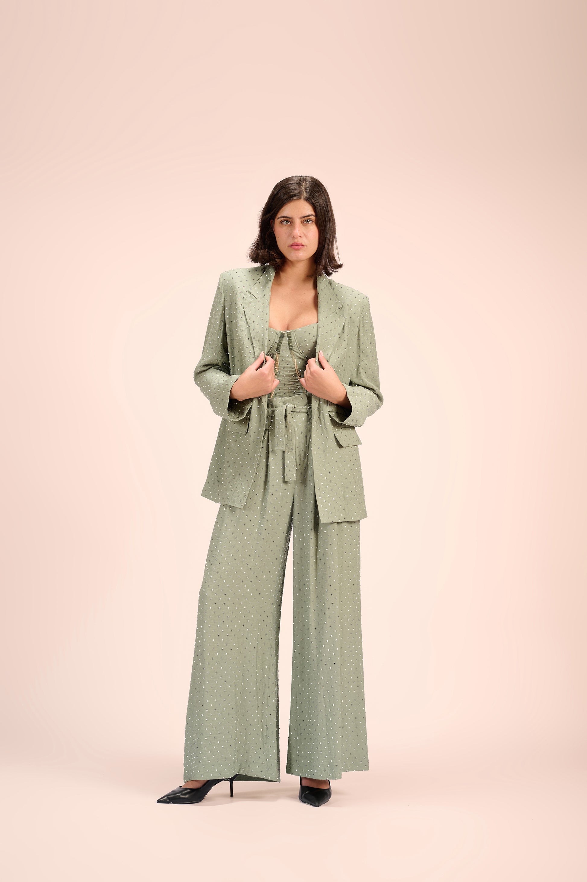 Silver-studded oversized blazer featuring front pockets and a geometric print satin lining.