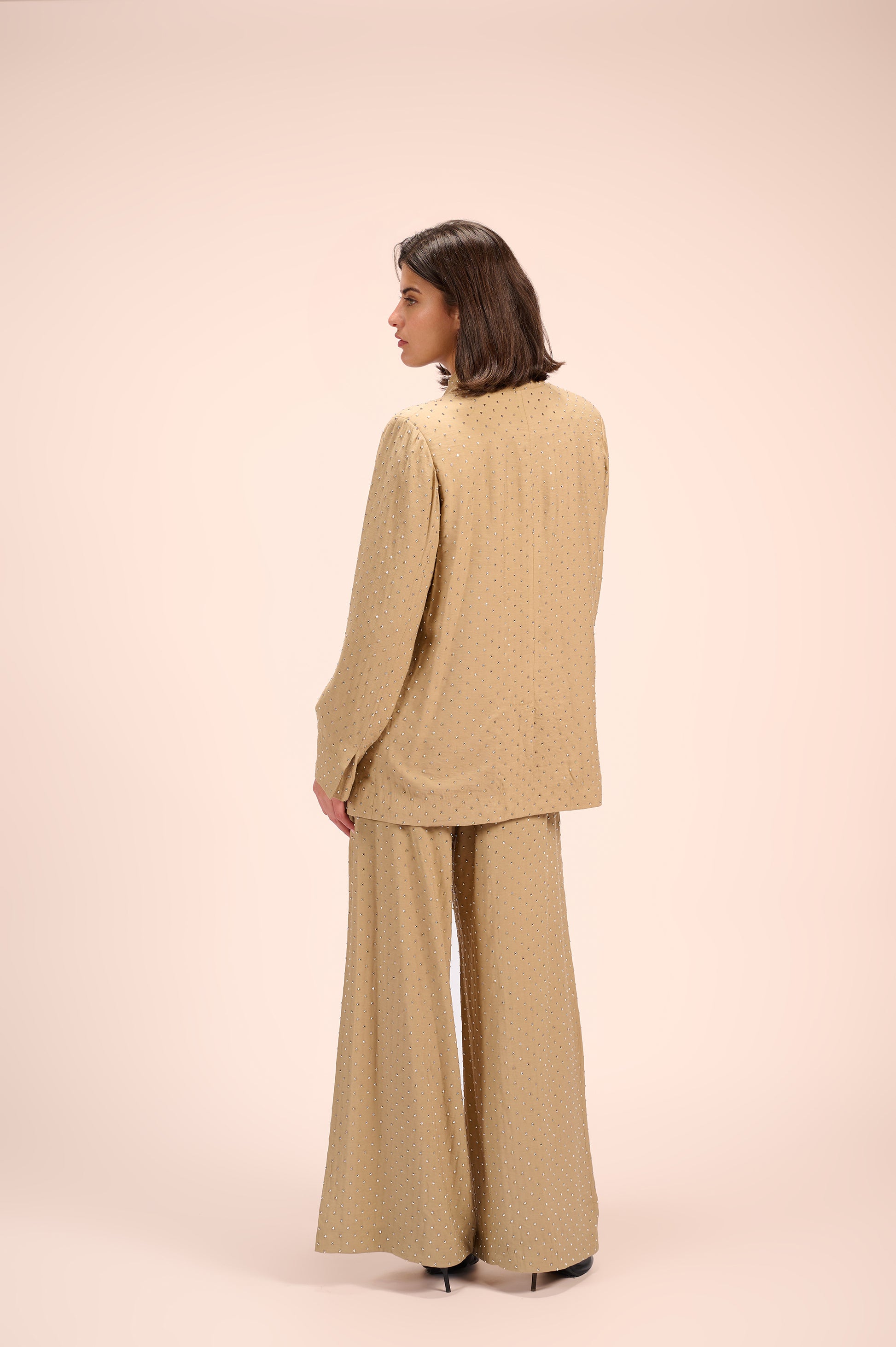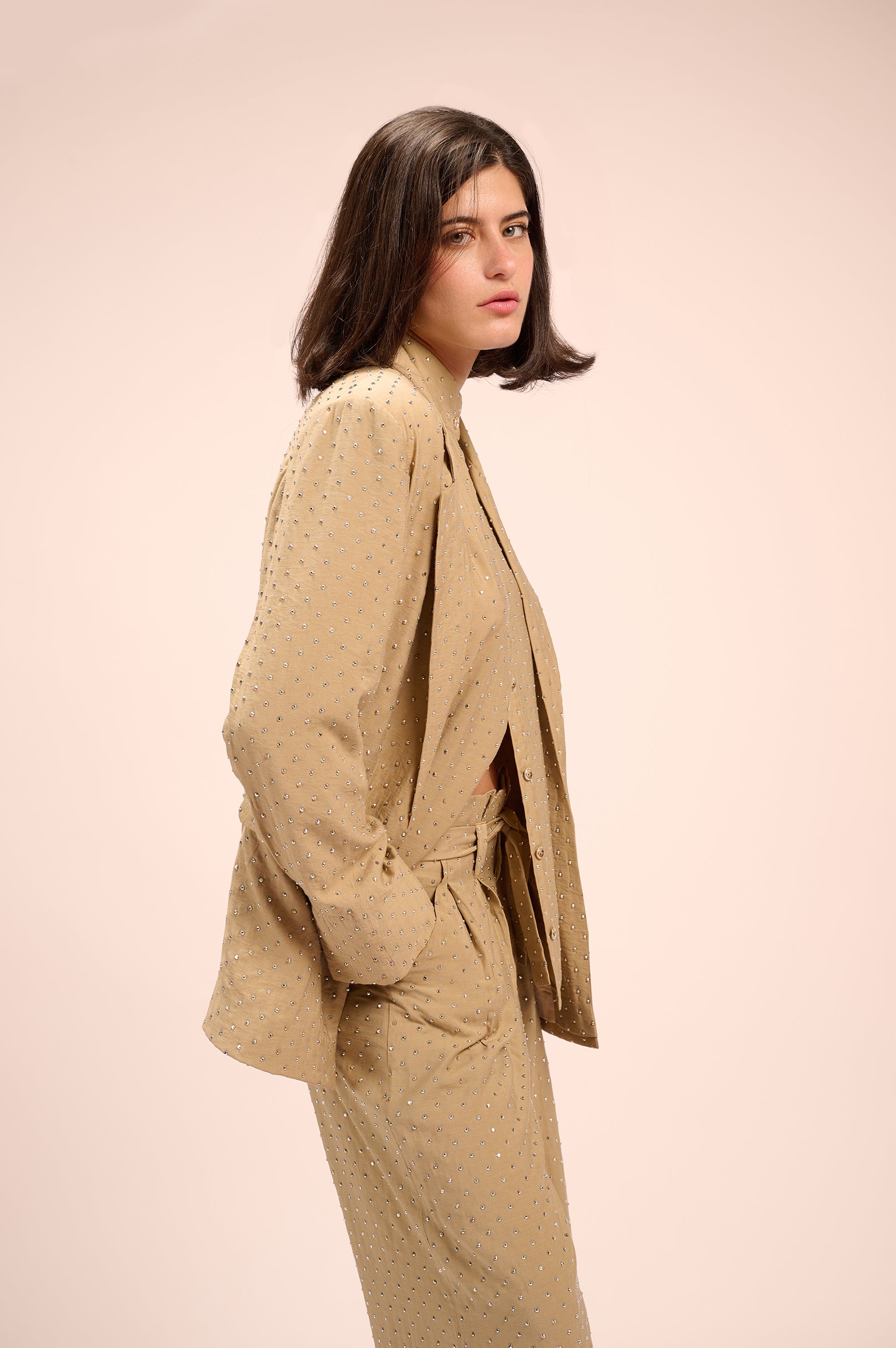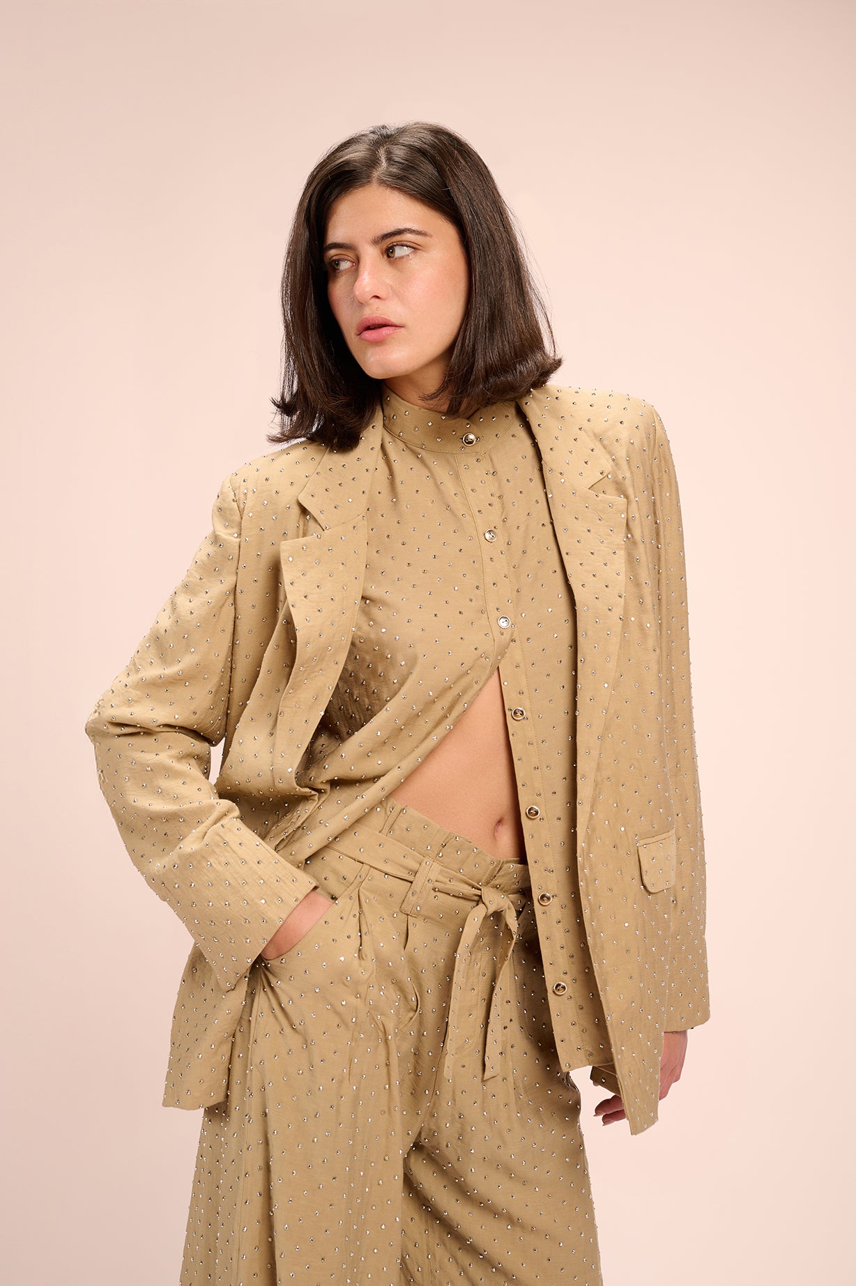 Silver-studded oversized blazer featuring front pockets and a beige satin lining.