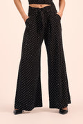 High-waisted, wide-leg silver-studded pants with a structured waistband, soft front pleats, and a relaxed, fluid silhouette. Removable belt for an adjustable fit. Featuring side-seam pockets.