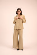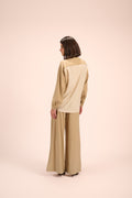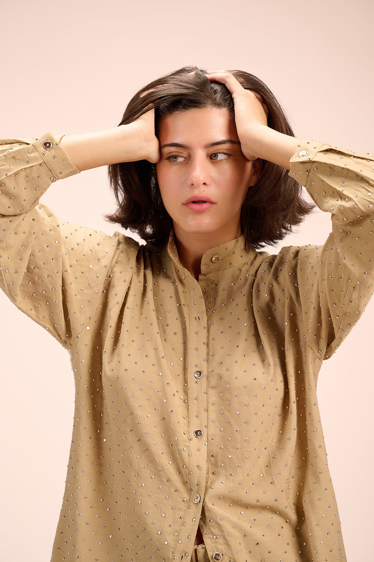 Silver-studded oversized shirt with mandarin collar and colorblocked back.